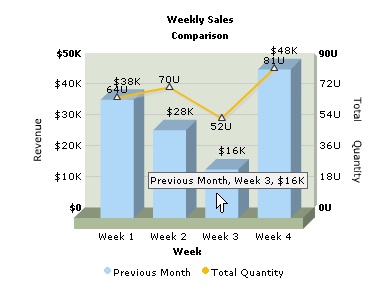 | The example below will add 2 datasets for a combination chart. The first dataset with 'Previous Month' as seriesName, will be set to Primary Y-Axis and have $ as number prefix. The second dataset with 'Total Quantity' as seriesName, will be set to Secondary Y-Axis, have a number suffix U and tringular anchors. |